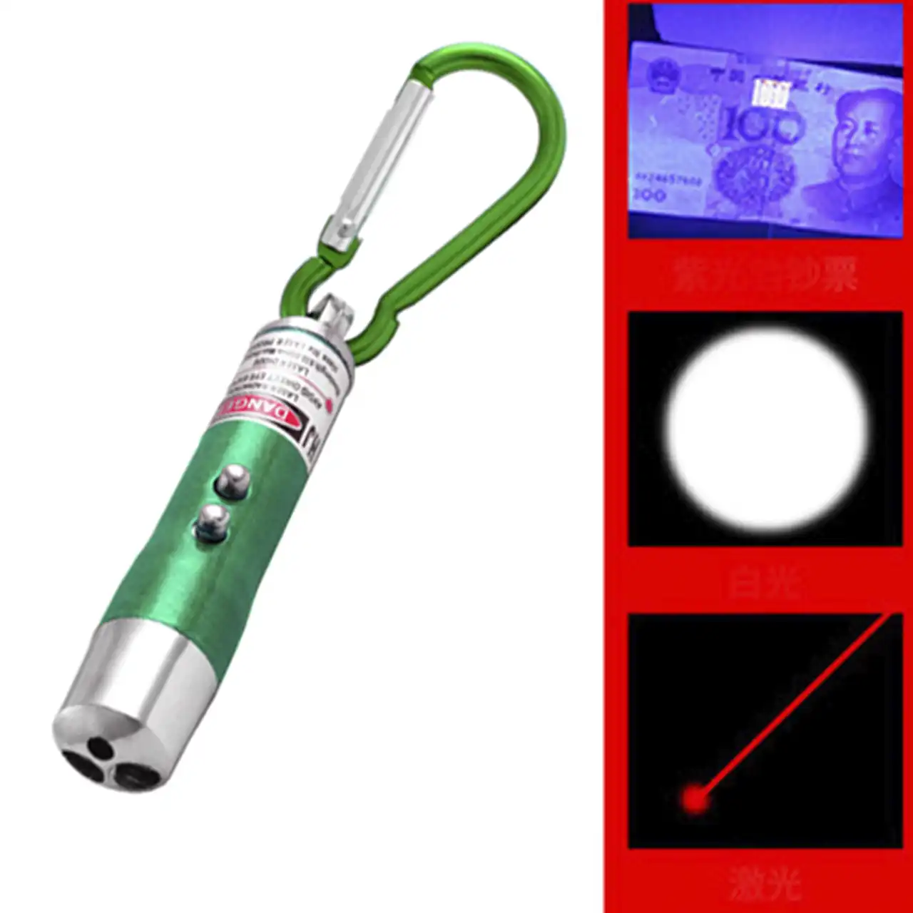 Працює у **трьох режимах** — стандартне біле світло (LED), ультрафіолет (UV) для перевірки купюр чи маркування, та **червоний лазер** для розваг або презентацій.