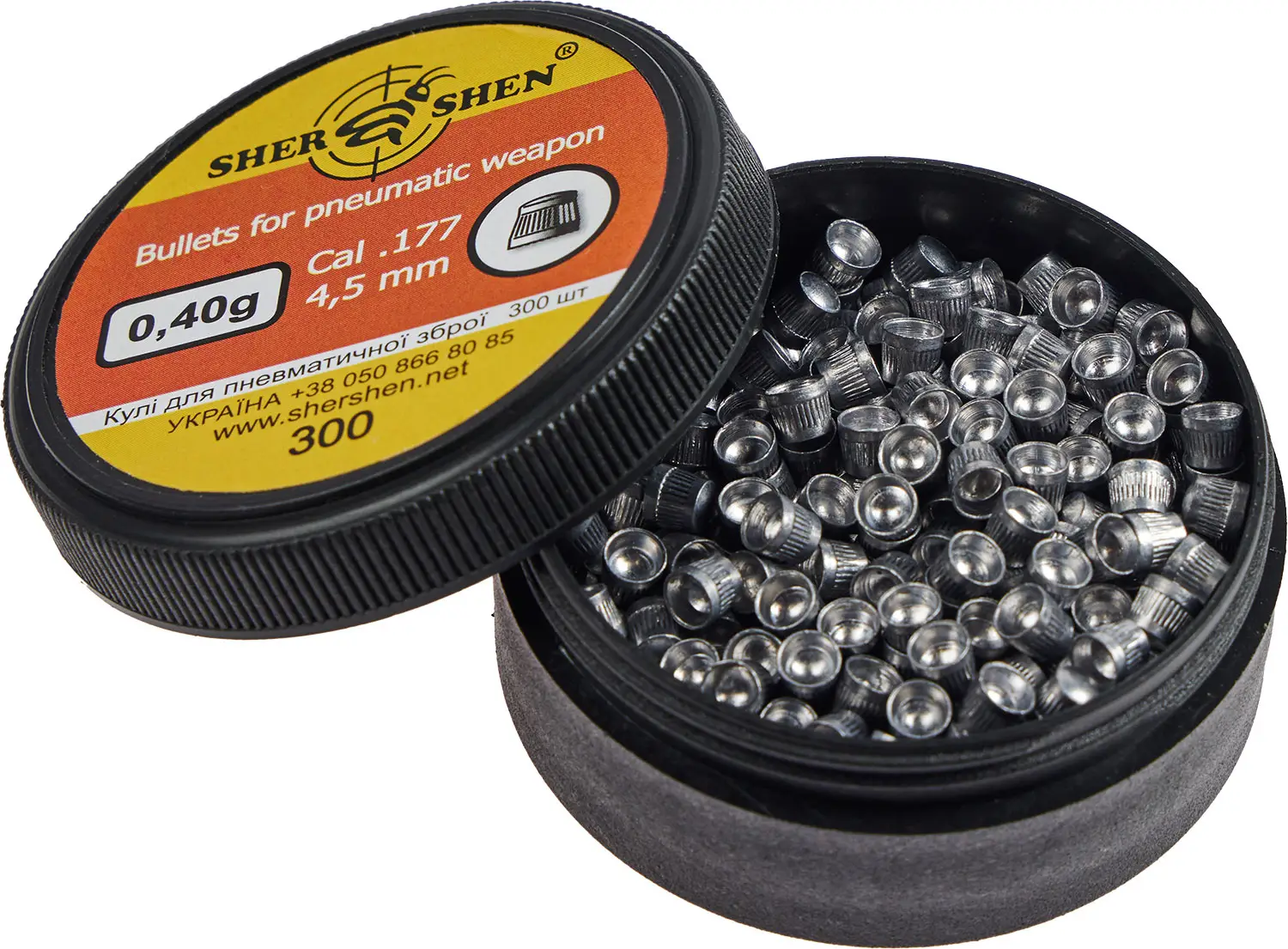 Кулі Шершень 0.40г 4.5мм 300шт. (1057.00.25) - Куля є пустотілим свинцевим конічним стаканчиком з опуклим дном в головній частині. Виготовляється методом штампування. Через свою форму отримала назву «ковпачкова». Відрізняється від DS-0,28g великою вагою та покращеними балістичними характеристиками за рахунок перерозподілу ваги в носову частину кулі та збільшення діаметра головної частини, що зменшує ймовірність перекосу кулі в каналі ствола. Призначена для розважальної стрільби за різними мішенями. Дальність ефективної стрілянини – до 20 метрів.
