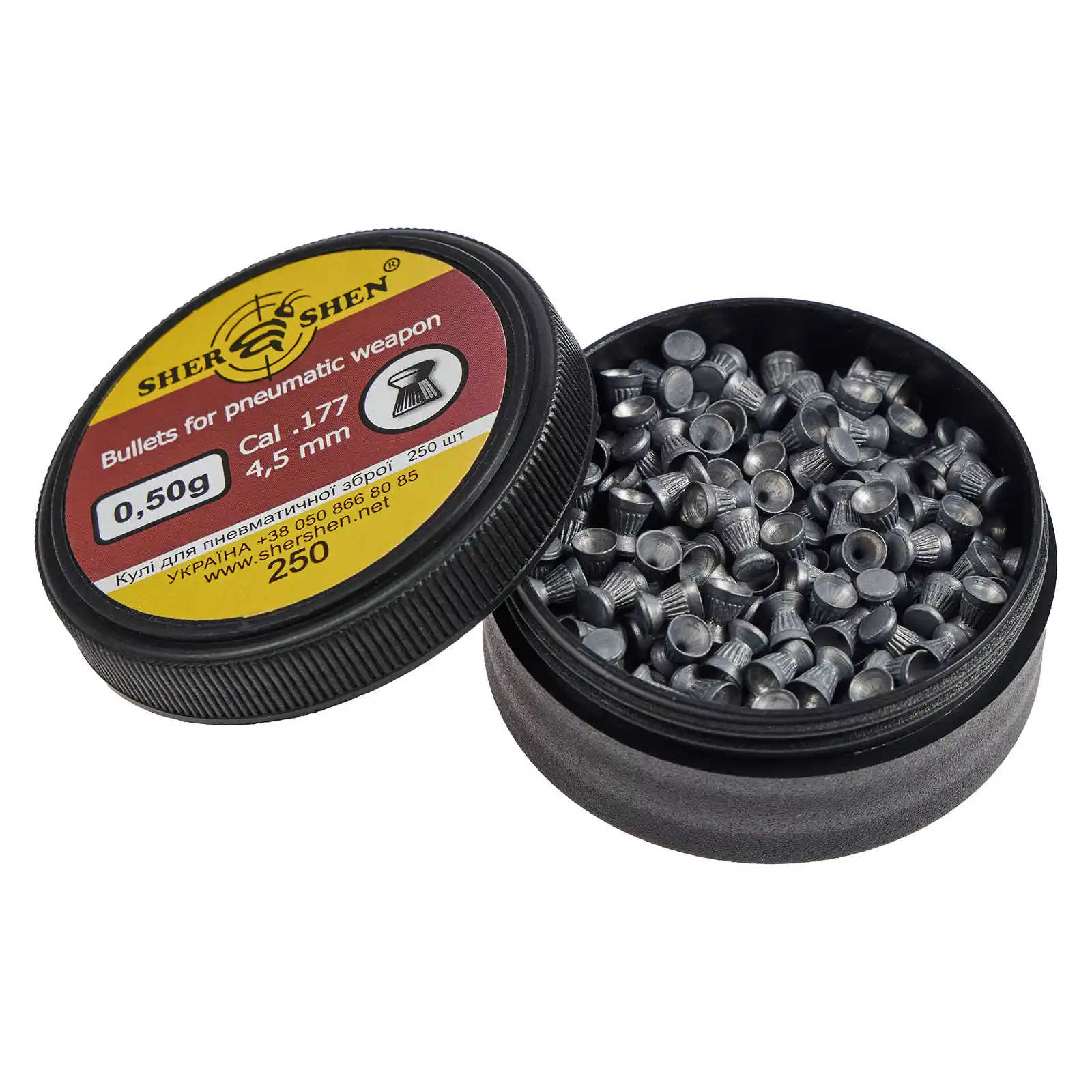 Кулі Шершень 0.50г. 4.5мм. 250 шт. (1057.00.26) - кулі з плоскою головною частиною, має поліпшені характеристики, позиціонується як "матчева" (match, wadcutter). Призначені для тренувальної спортивної та розважальної стрільби по паперових та інших мішенях. При попаданні в ціль, куля вибиває в папері круглий отвір з рівними краями, що полегшує підрахунок окулярів.