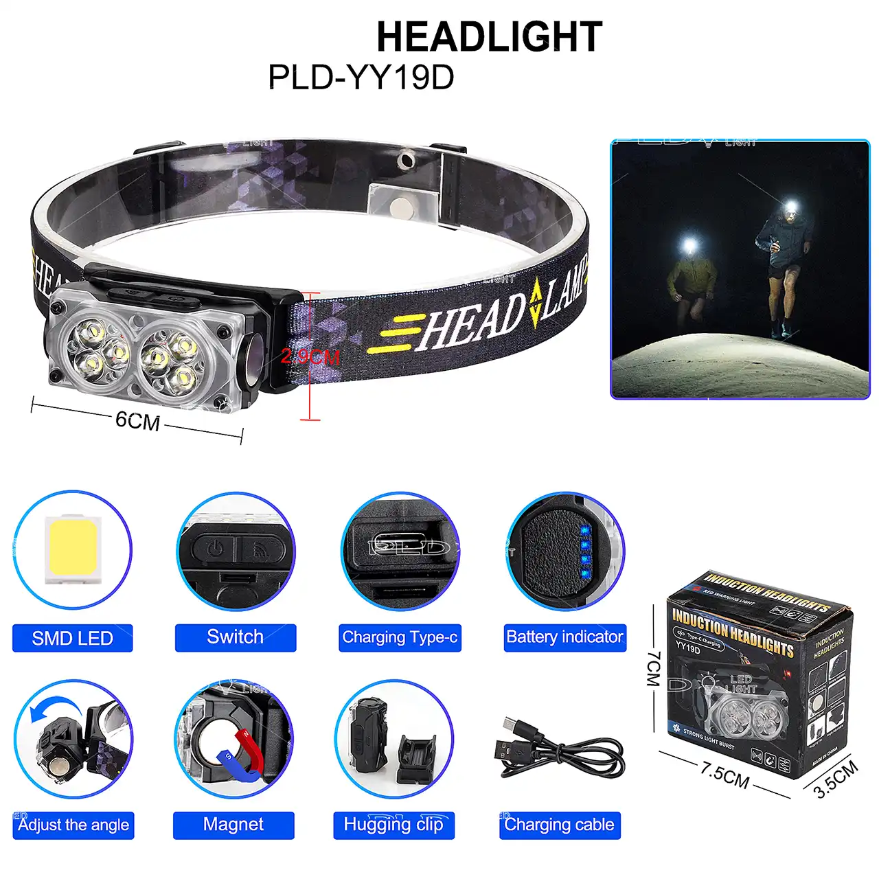 Ліхтар налобний YY-19D-6SMD із 6 діодами SMD, трьома режимами освітлення, магнітом, кліпсою, індикацією заряду та USB Type-C зарядкою.