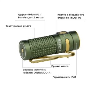 Ліхтар ручний Olight Baton 4 OD Green — компактний EDC-ліхтар із яскравістю до 1300 люмен, дальністю 170 м, магнітною основою та автономністю до 30 днів у мінімальному режимі. Надійний помічник для щоденного використання.