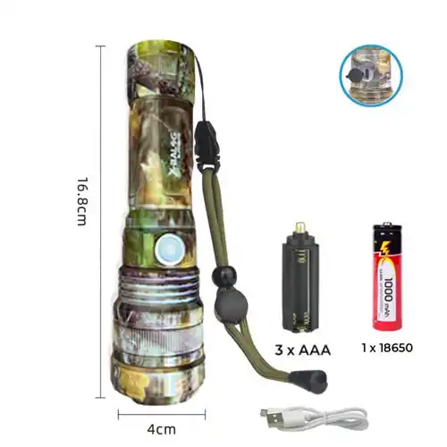 Електроживлення забезпечує елемент 1×18650. У комплектацію входить Ліхтар, АКБ, USB Кабель.