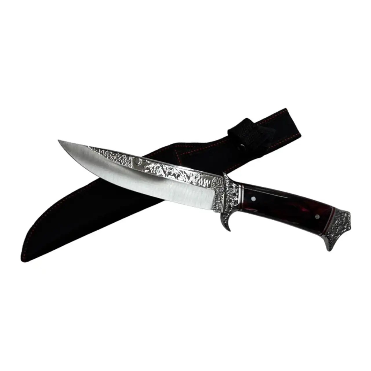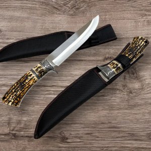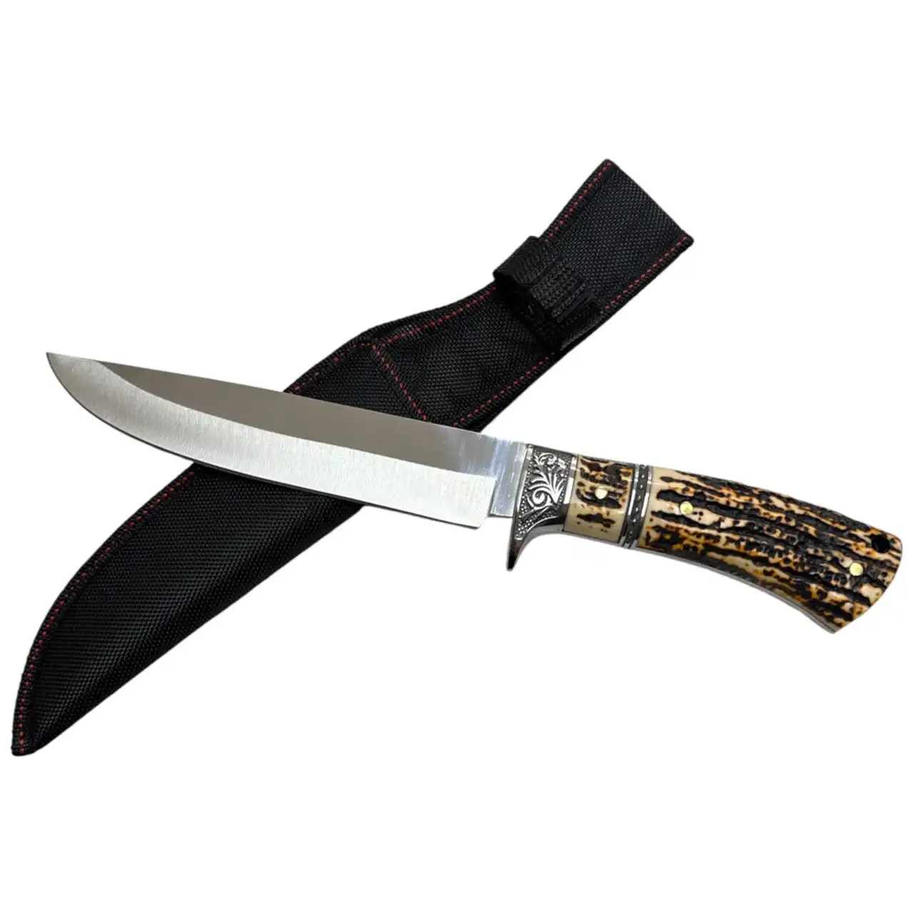 Ніж тактичний / мисливський SF-2-271 — ефектний мисливський ніж у класичному стилі з декоративним різьбленим больстером і анатомічною рукояттю під оленячий ріг. Полірований клинок із нержавіючої сталі поєднує практичність і презентабельний вигляд. У комплекті — міцні тканинні піхви з червоною прострочкою.