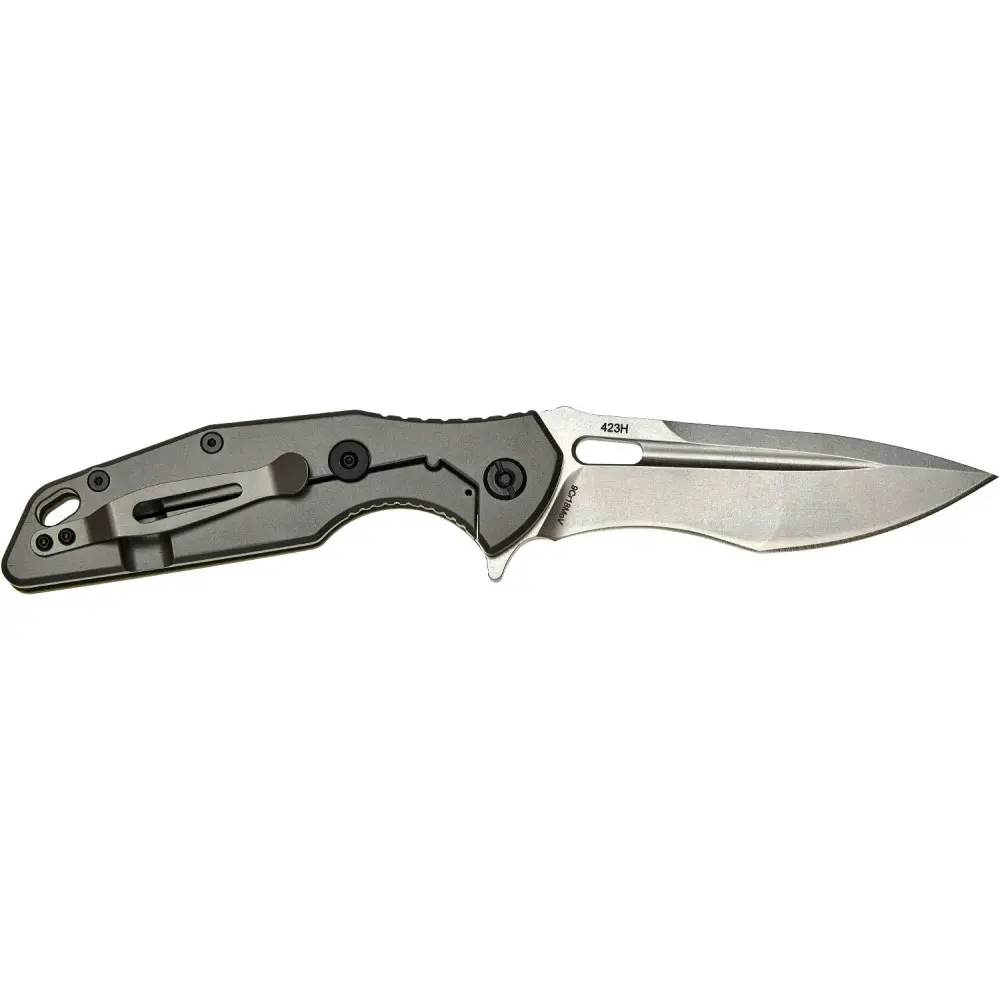 Відкривається однією рукою за допомогою підпальцевої виїмки або фліппера, а шарикопідшипник забезпечує чудово плавний хід при відкритті. Форма клинка - це поєднання Drop-Point і S-подібного клинка і має довжину 9,7 см і товщину в 3 мм з нержавіючої сталі марки 9Cr18MoV що краще, ніж у попередніх моделей, має гарну корозійну стійкість, відмінно тримає заточування і легко правиться, а також фінішну обробку Stonewash яка вбереже від незначних потертостей та подряпин при частій експлуатації.