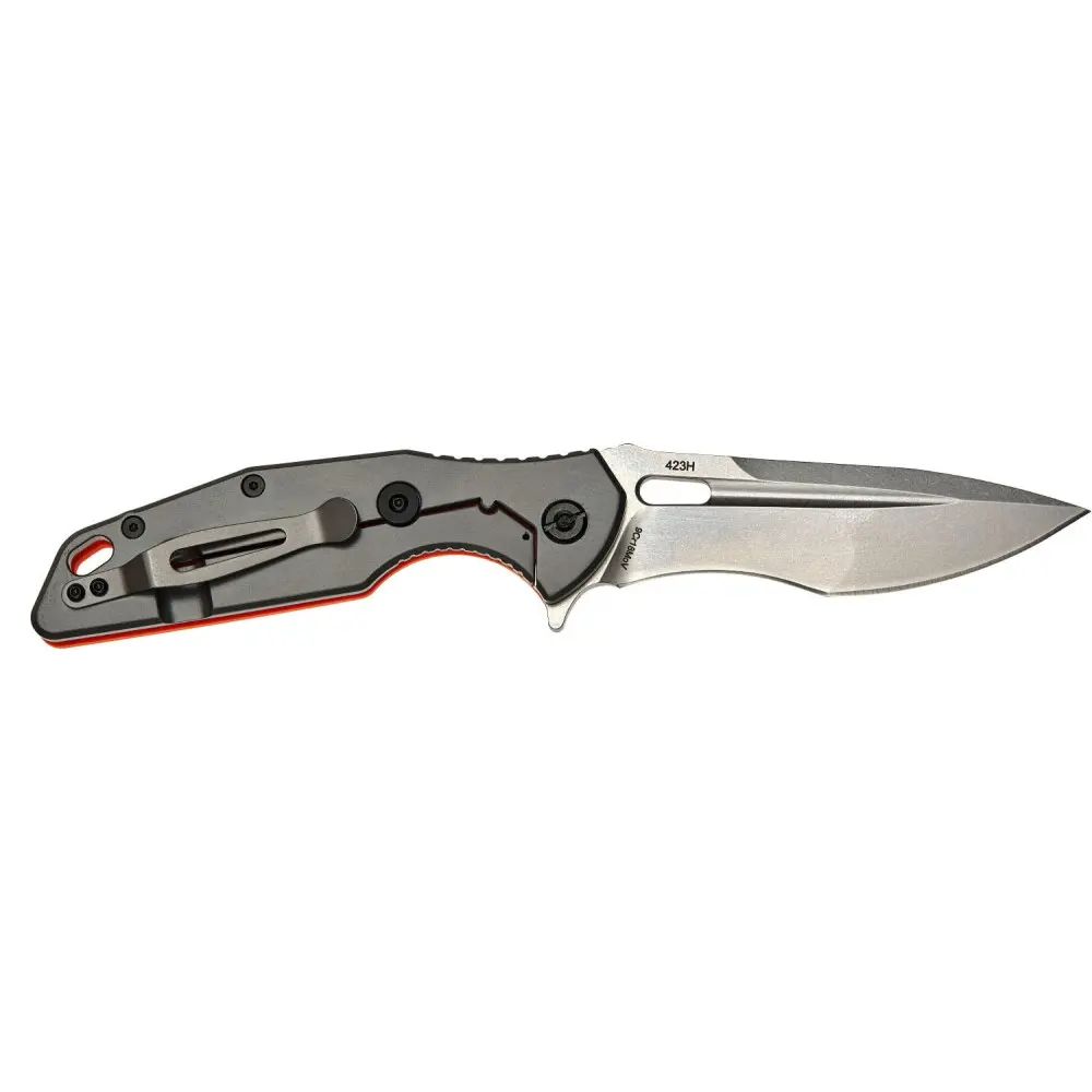 Відкривається однією рукою за допомогою підпальцевої виїмки або фліппера, а шарикопідшипник забезпечує чудово плавний хід при відкритті. Форма клинка - це поєднання Drop-Point і S-подібного клинка і має довжину 9,7 см і товщину в 3 мм з нержавіючої сталі марки 9Cr18MoV що краще, ніж у попередніх моделей, має гарну корозійну стійкість, відмінно тримає заточування і легко правиться, а також фінішну обробку Stonewash яка вбереже від незначних потертостей та подряпин при частій експлуатації.