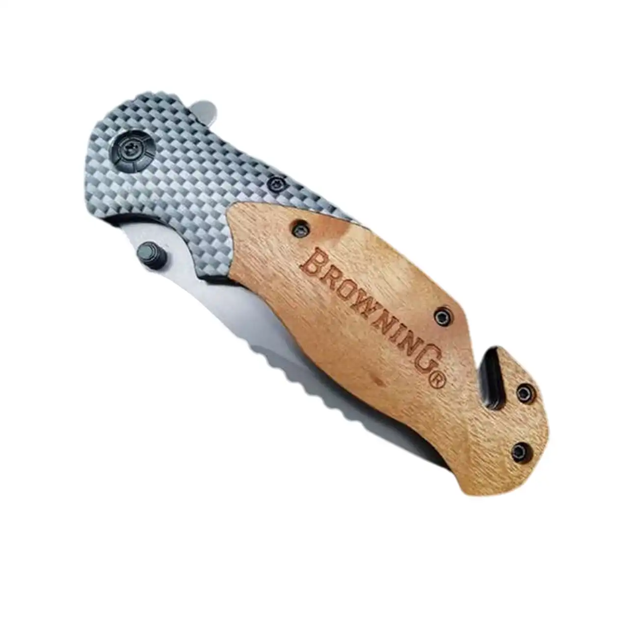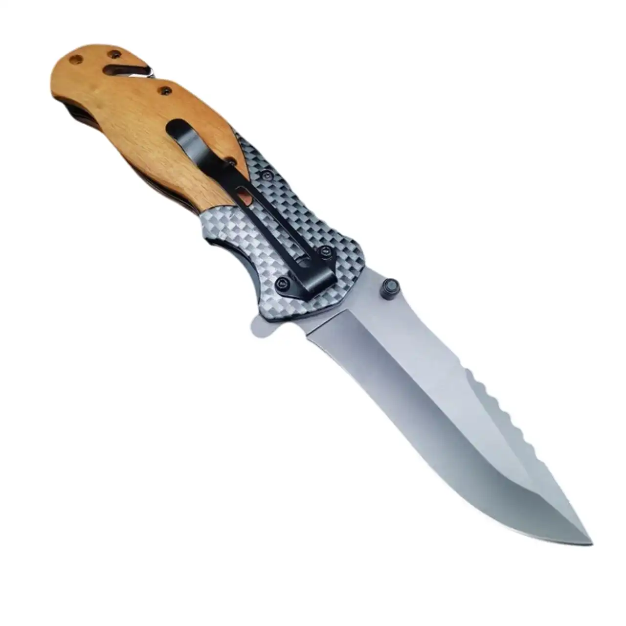 Рукоятка оснащена карбоново-дерев’яними накладками, які не лише додають стилю, а й забезпечують зручний та надійний хват. Завдяки системі замка Liner Lock ніж безпечно фіксується у відкритому положенні, а пружинний механізм відкривання дозволяє швидко привести його в робочий стан.