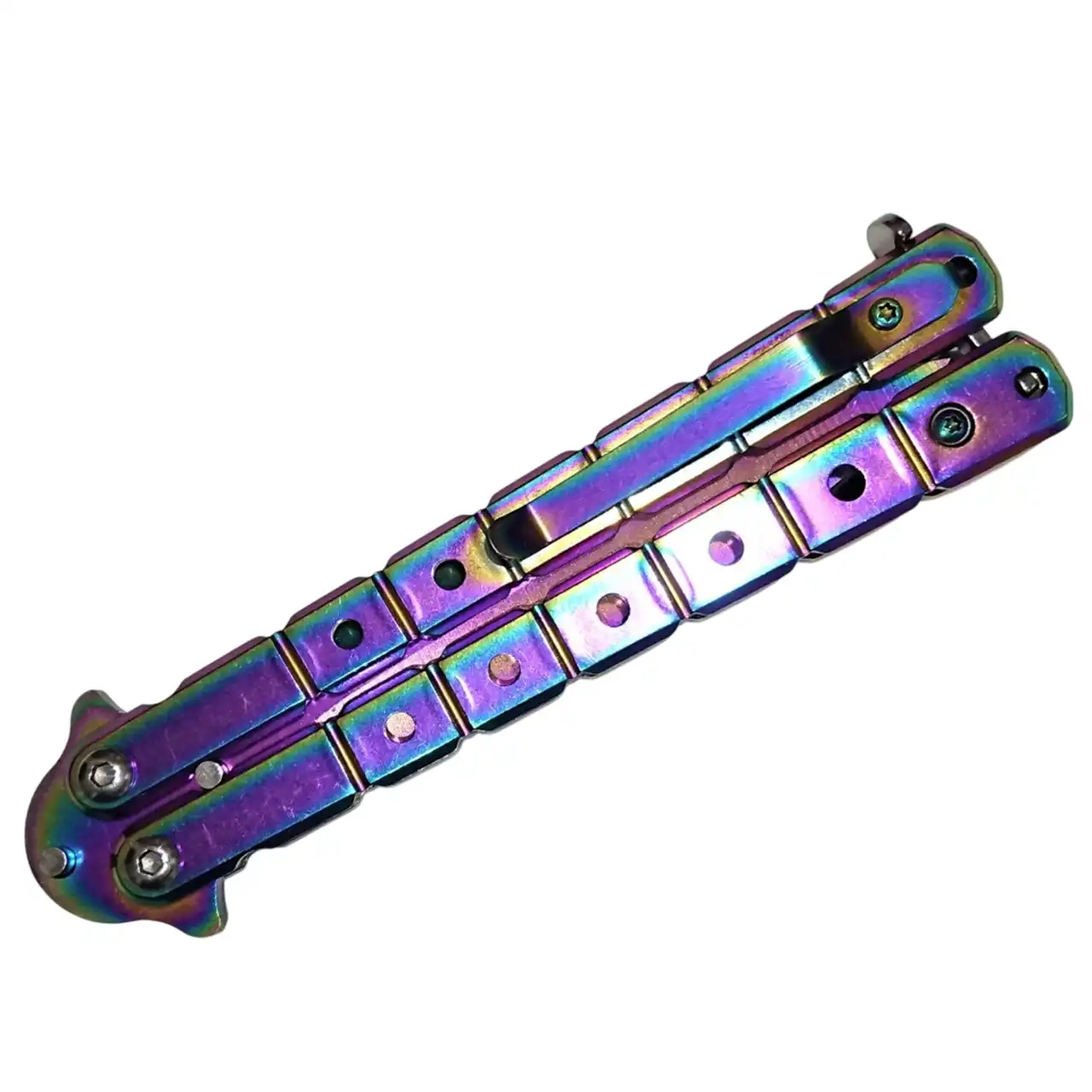 Ніж складний Метелик (SF-2-266) з клинком і ручкою кольору хамелеон. Лезо 9×2 см, довжина 22 см, алюмінієва ручка, кліпса для пояса.