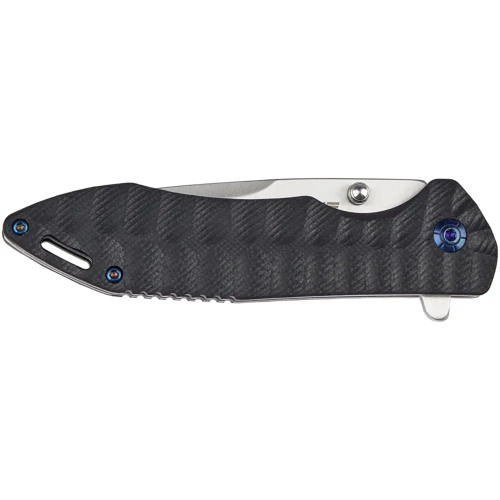 - Накладки на руків'я виконані зі склотекстоліту G10 з насічкою, яка забезпечує надійне утримання ножа навіть вологою рукою або в рукавичці.