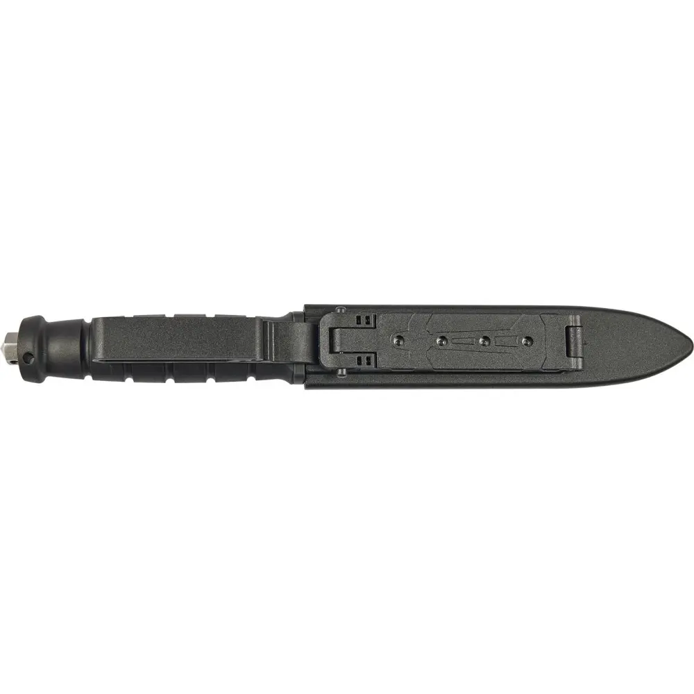 - На торці розміщений потужний склобій з отвором під темляк. В комплекті йдуть міцні піхви із пластику із двома варіантами кріплення: на ремінь або систему MOLLE.
