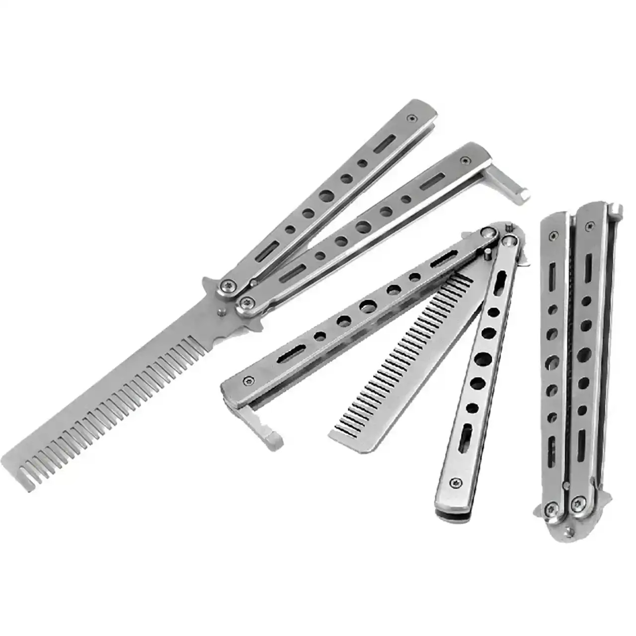 Ніж-метелик 26-C25S — це креативний гібрид класичного балісонга та практичного гребінця для бороди й вус. Замість гострого леза він оснащений сталевим гребенем, що робить його на 100% безпечним та легальним. Це ідеальний інструмент для тих, хто хоче опанувати ефектні трюки (фліппінг), не ризикуючи отримати порізи, та водночас мати під рукою брутальний аксесуар для догляду за собою.