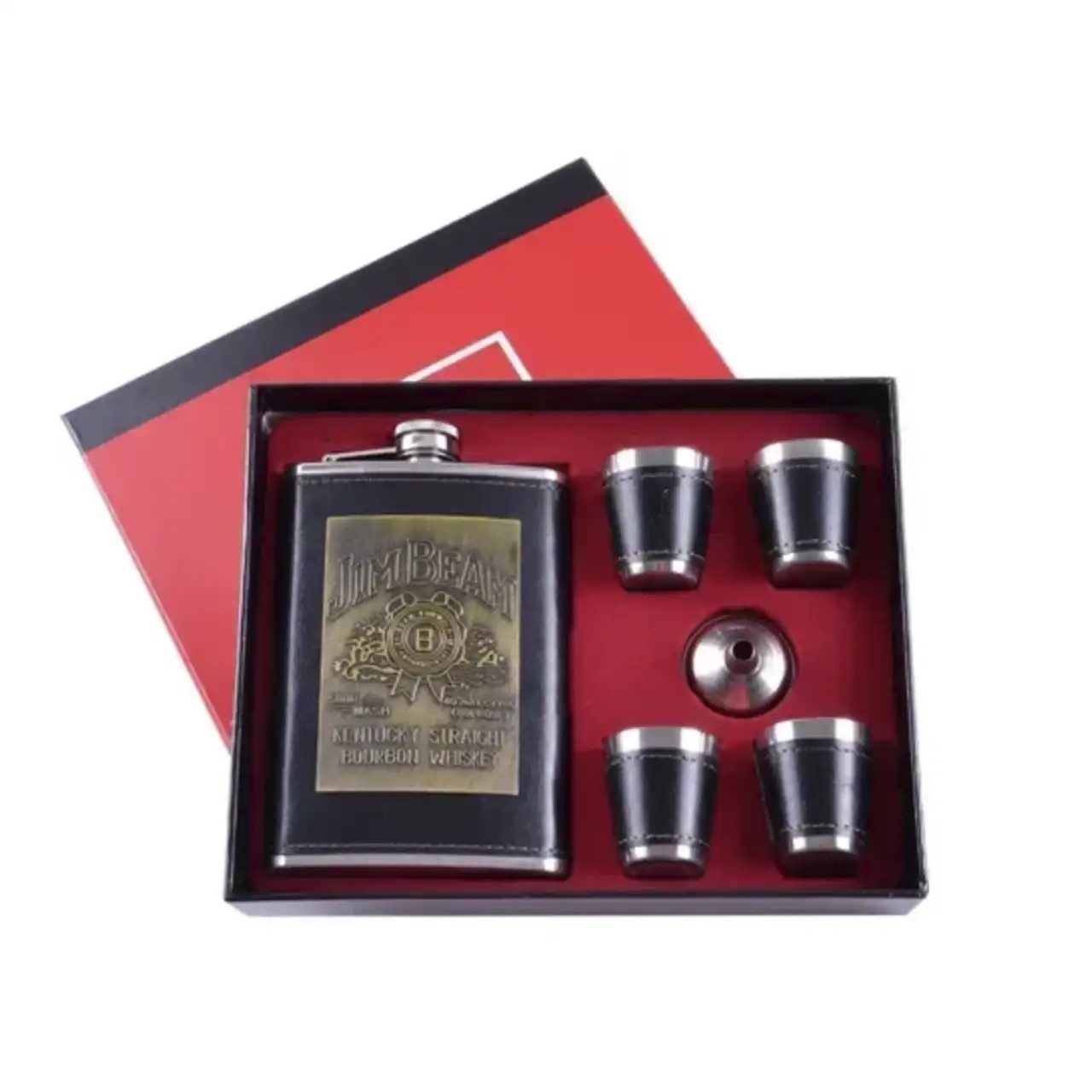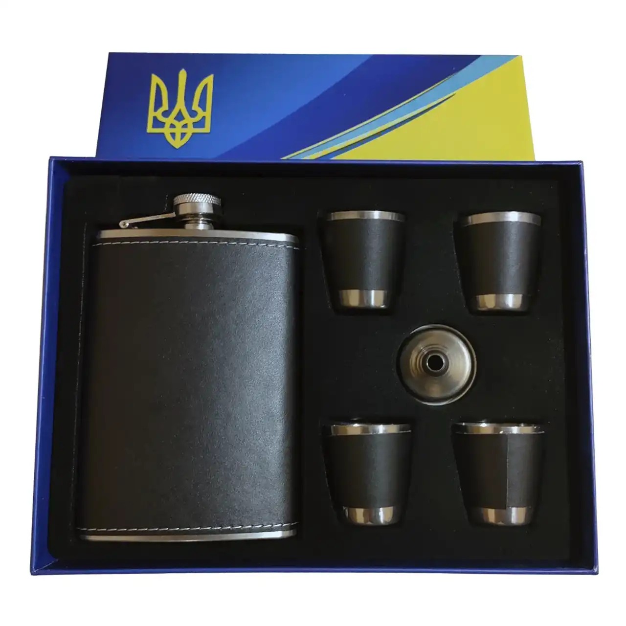 Комплект доповнюють 4 металеві чарки по 30 мл зі шкіряною обробкою, виконані в єдиному стилі з флягою, а також зручна лійка, що забезпечує акуратне наповнення без проливання.