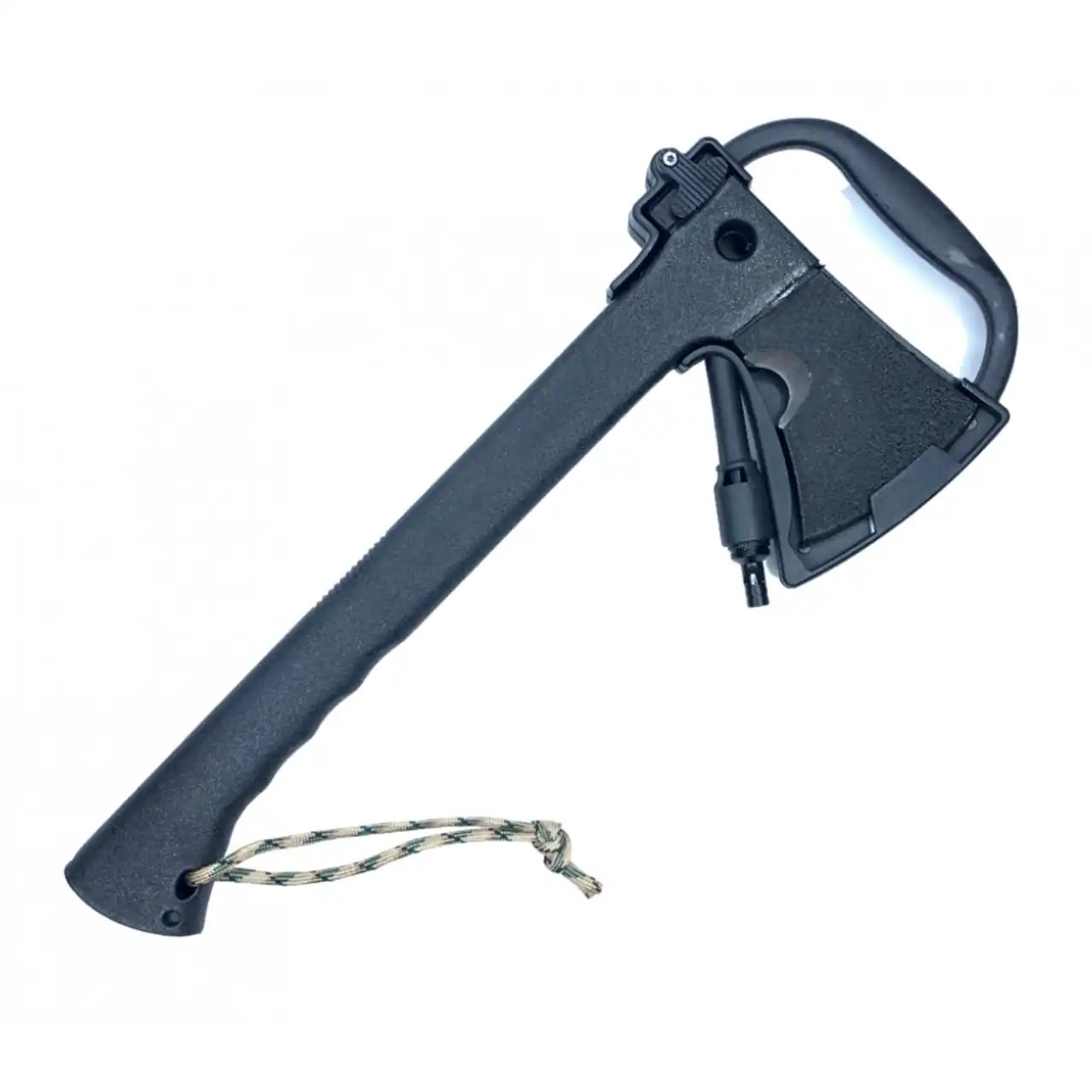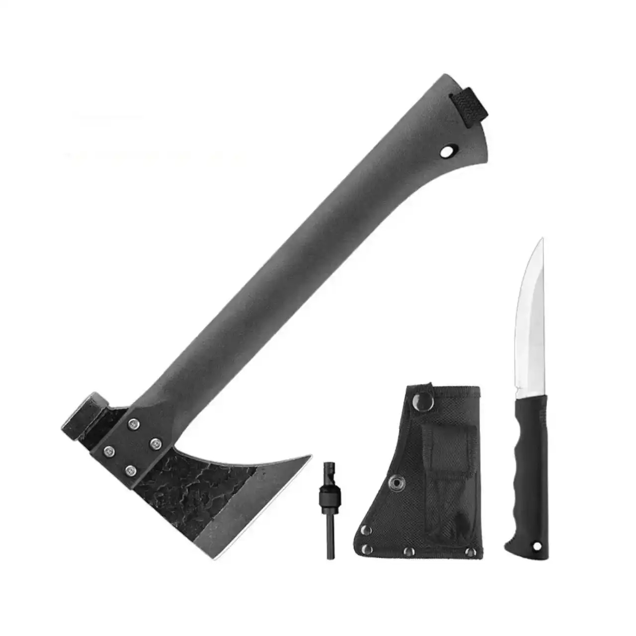 Топорище виконане з міцного полімеру, який доповнений прогумованими вставками для забезпечення надійного хвату та комфорту при тривалому використанні. У нижній частині руків'я передбачено спеціальний отвір для ремінця. Сокира постачається в комплекті з практичними пластиковими піхвами, які обладнані надійною застібкою та зручною ручкою для безпечного перенесення.