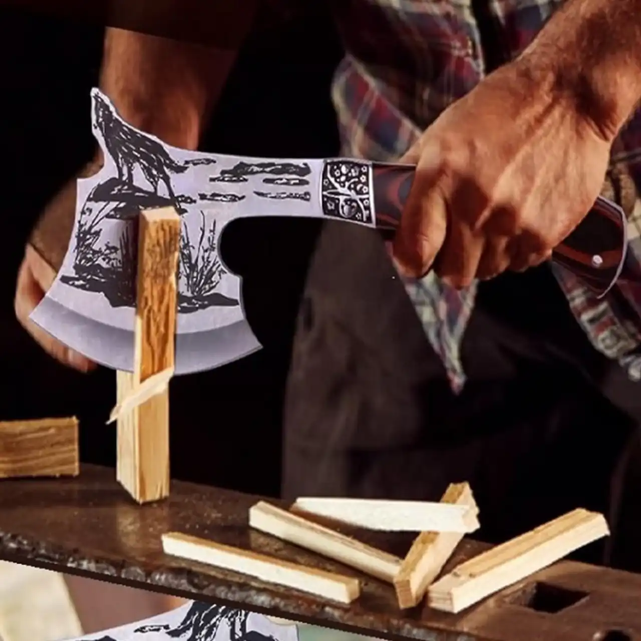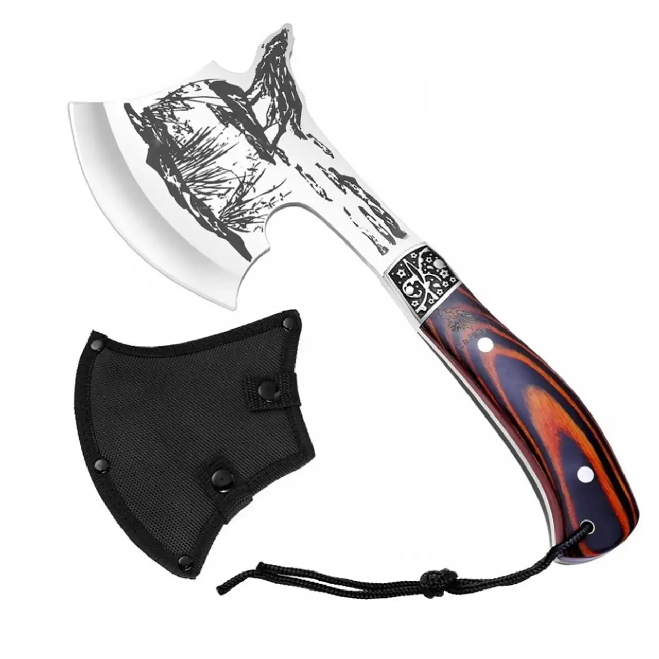 Сокира туристична a4014 — це поєднання функціональності, надійності та оригінального дизайну. Її головна особливість — ефектне художнє оформлення леза із зображенням вовка, що підкреслює дикий характер інструмента та зв’язок з природою.