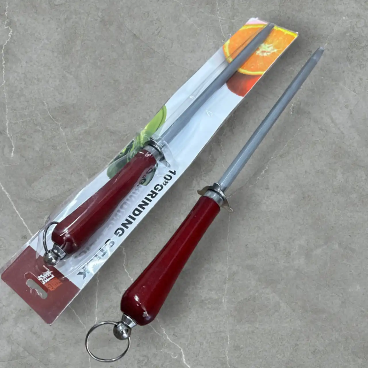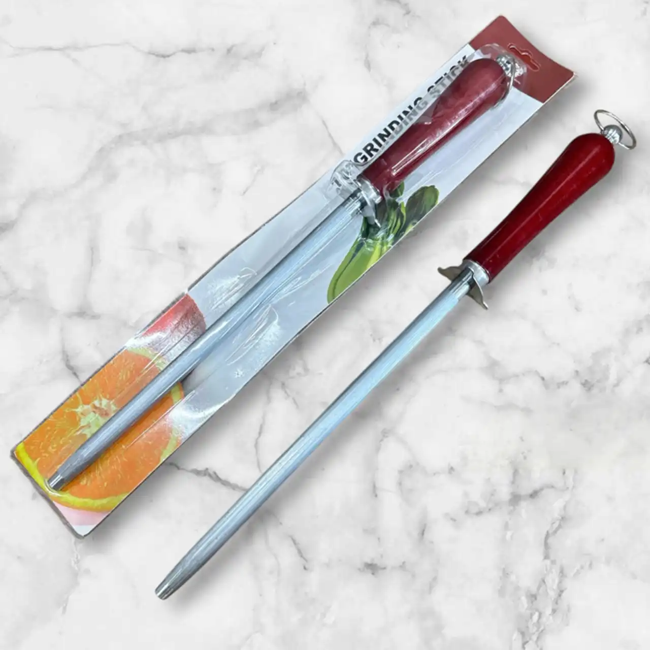 Бордова пластиковa рукоять з ергономічною формою забезпечує зручний і надійний хват, а захисний упор захищає пальці під час роботи. Металеве кільце дозволяє зручно підвішувати мусат для зберігання.