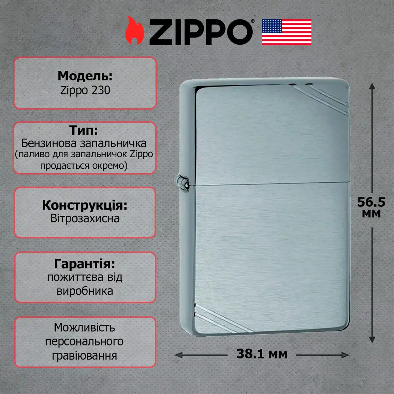 Zippo 230 Vintage Brushed Chrome — це не просто запальничка, а символ класичного стилю, надійності та американської майстерності, який залишиться актуальним через десятиліття.