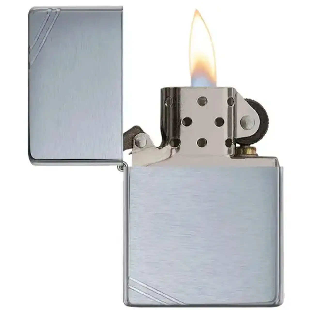 Запальничка Zippo 230 VINTAGE BR FIN CHROME— класична бензинова запальничка з серії Vintage, створена у США. Відрізняється характерними діагональними лініями на кришці, сатиновим металевим корпусом і легендарною якістю Zippo.