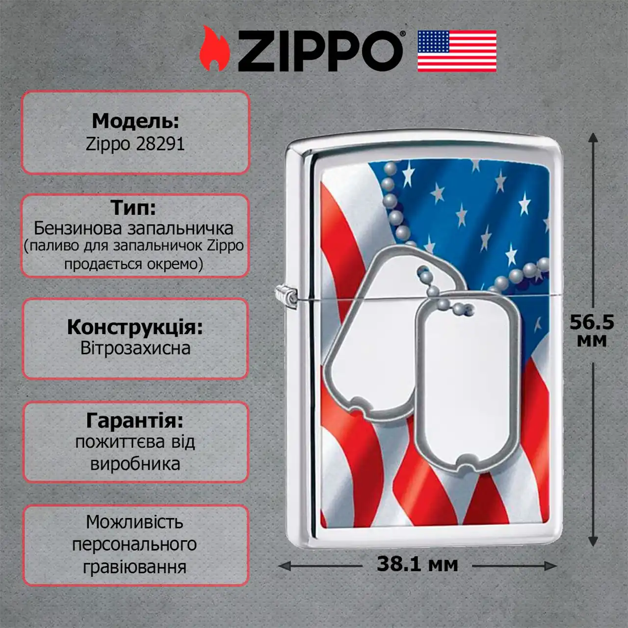 Запальничка Zippo 28291 FLAG&DOG TAG— бензинова запальничка з глянсовим хромованим корпусом і рельєфним зображенням американського прапора та військових жетонів. Виготовлена у США, має вітрозахисну систему, кремнієвий підпал і пожиттєву гарантію.