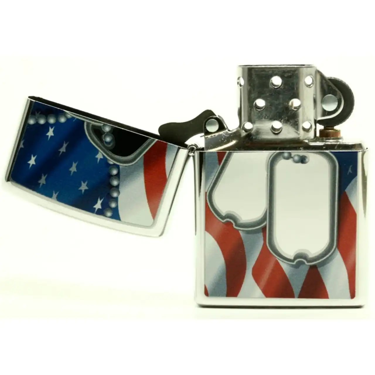 Виконана з латуні з покриттям High Polish Chrome, вона має дзеркальний блиск і характерне зображення — два армійські жетони (dog tags) на тлі прапора США. Такий дизайн надає запальничці неповторного характеру й робить її відмінним подарунком для колекціонерів, військових чи шанувальників патріотичних аксесуарів.