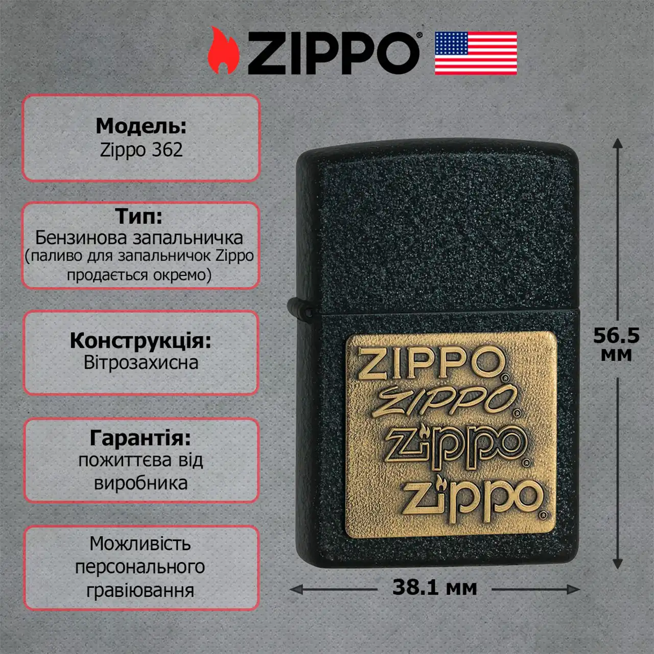 Запальничка Zippo 362 BRASS EMBLEM BLACK CRACKLE — класична бензинова запальничка з чорним кракле-покриттям і латунною емблемою Zippo. Виготовлена у США, має вітрозахисну конструкцію, кремнієвий підпал і пожиттєву гарантію.