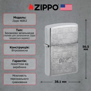 Вітрозахисна бензинова запальничка Zippo 46853 James Bond 007 з кремнієвим підпалом. Металевий корпус сірого кольору, легендарне клацання Zippo та пожиттєва гарантія від виробника. Виготовлена у США, підходить для гравіювання, поставляється у фірмовій коробці.
