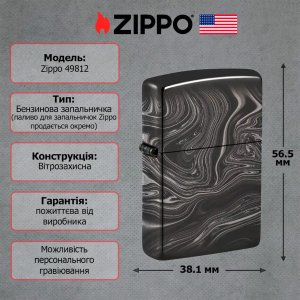 Бензинова вітрозахисна запальничка Zippo 49812 Marble Pattern Design з кремнієвим підпалом. Глянцевий чорний металевий корпус з мармуровим візерунком, виконаним за технологією Photo Image 360°. Пожиттєва гарантія від виробника, виготовлена у США, постачається у подарунковій коробці.