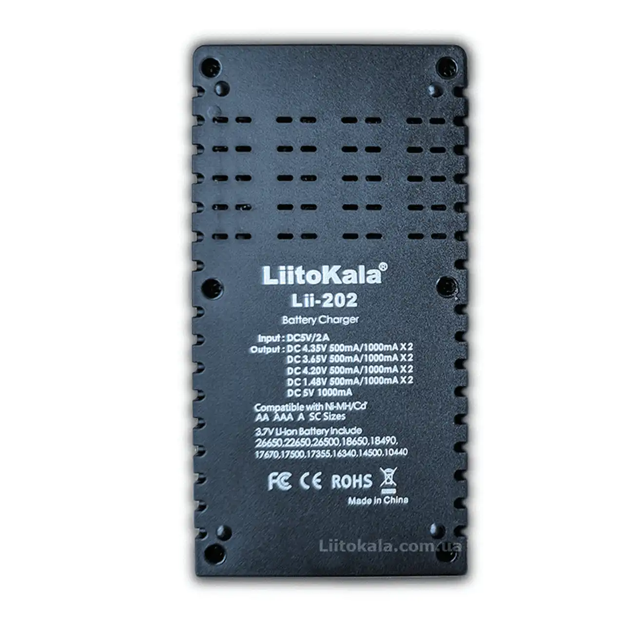 Lii-202 має інформативну світлодіодну індикацію — 4 поділки показують рівень заряду (25%, 50%, 75%, 100%). Просте керування однією кнопкою MODE дозволяє перемикати тип акумулятора або струм зарядки (0.5A / 1A).