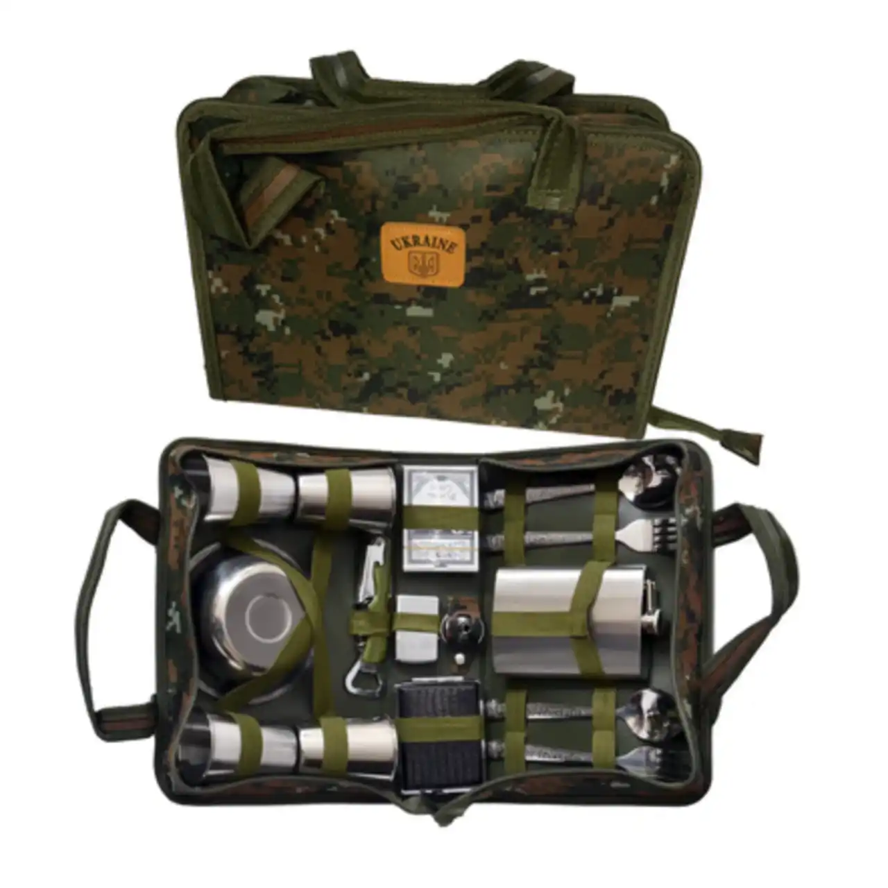 Комплект упаковано у **міцний камуфляжний кейс**, який зручно брати із собою. Усі предмети виготовлені з якісних матеріалів і продумані до дрібниць, щоб забезпечити максимум зручності в дорозі.